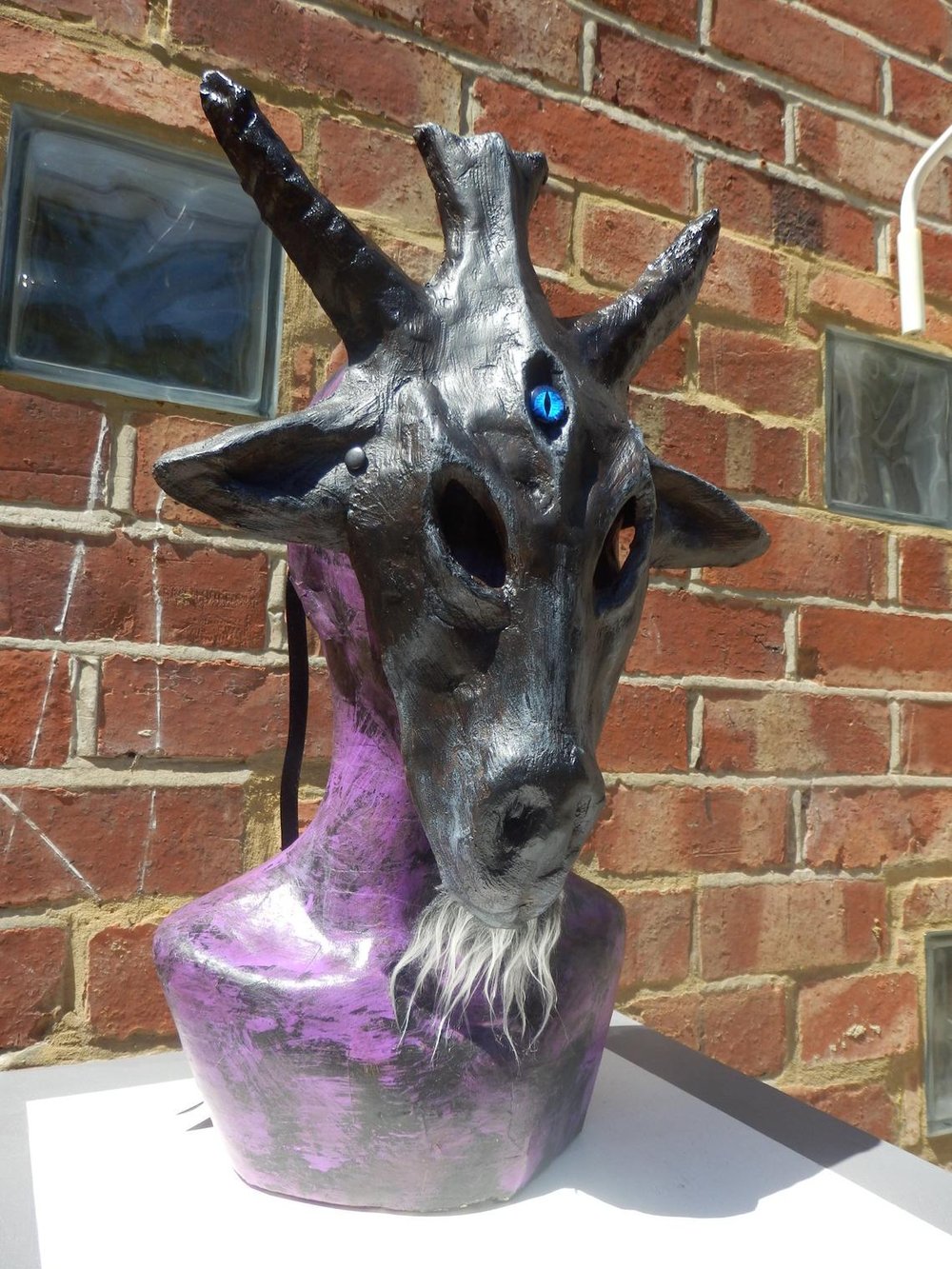 Baphomet Goats head mask made from papier mache using traditional venetian mask making techniques. I sculpted the mask in clay and then took a mould from this, the papier mache is layered inside the mould using recycled paper and non toxic glue paste. Once dry the mask is hand painted and then varnished so that it has a tough finish. The completed mask is tough and light weigh with a bit of give to it as well. Ties onto the head with black ribbons. Has a fake fur goatee beard and demonic third eye !